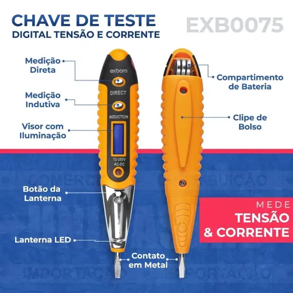 Chave Digital Detector Tensão 12-250V AC/DC Caneta detector de voltagem e corrente elétrica digital