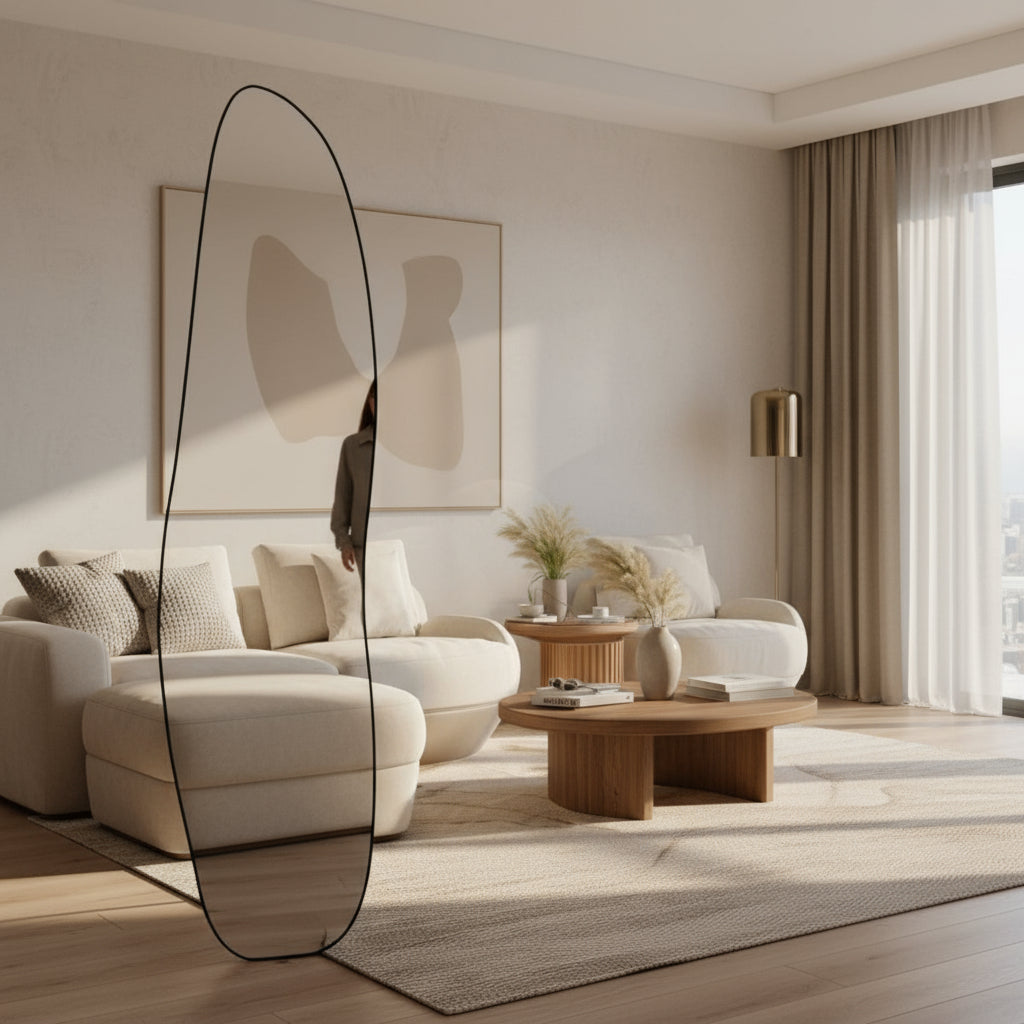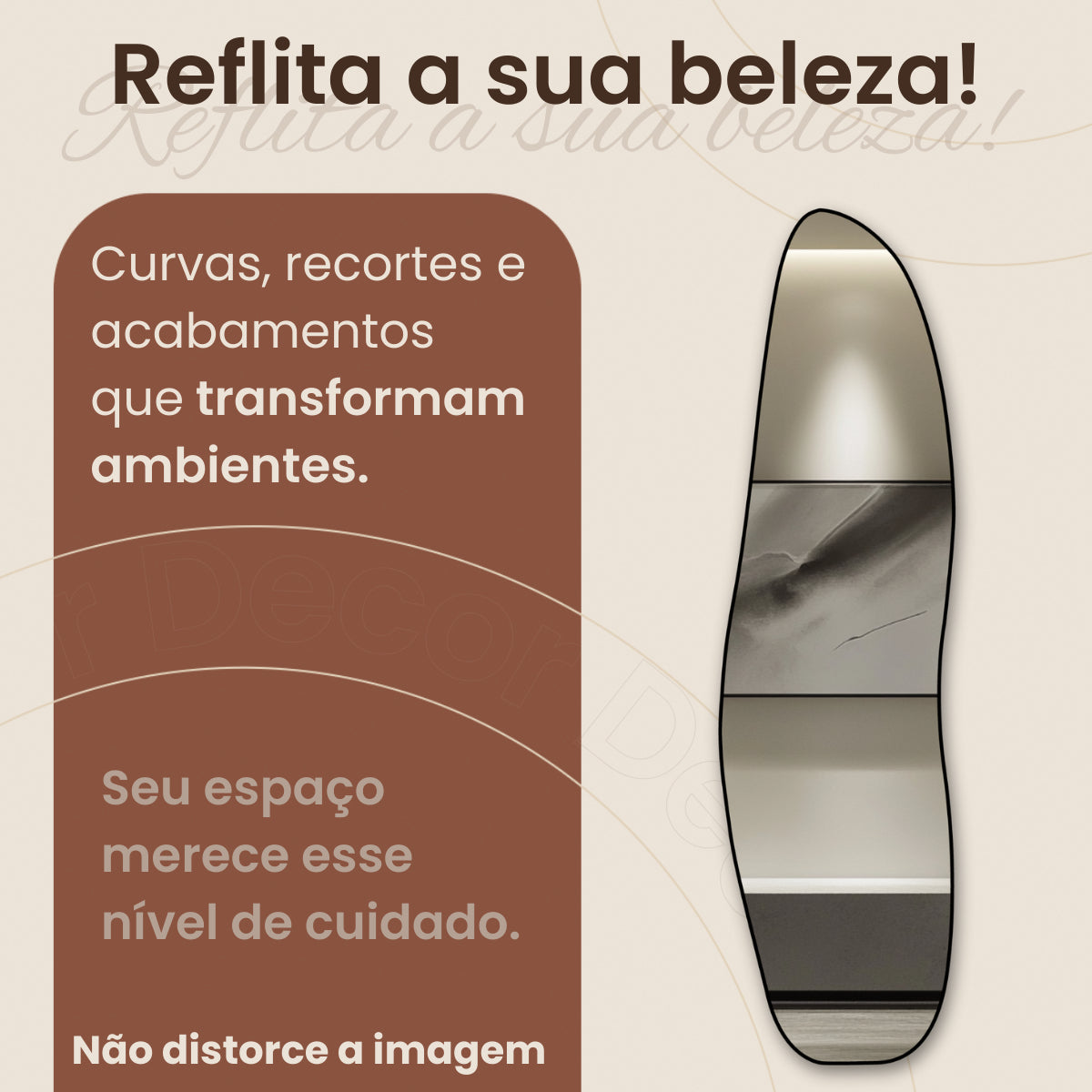 Espelho Abstrato Provador 146x36cm UzyShop – design abstrato moderno, 4 cores sofisticadas, vidro Float reflexivo, suporte ajustável em alumínio, peso 4kg. Ideal para quartos, closets, lojas, estúdios, corredores, salas. Visualização ampla de corpo inteiro com elegância. Compre agora com envio imediato para todo Brasil!