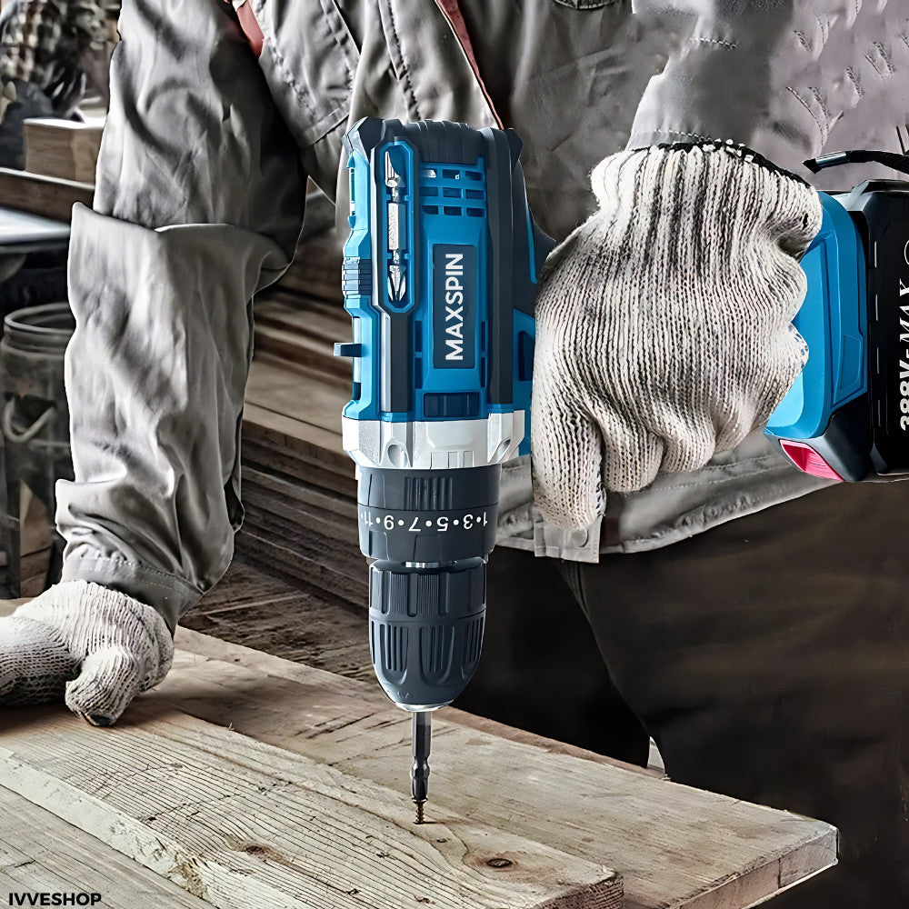 Furadeira e Parafusadeira MaxSpin 48V Azul – potência profissional, rotação dual (400/1400 RPM), torque ajustável 32N.m, 2 baterias 1300mAh, carregador bivolt, 22 acessórios, maleta resistente. Ideal para furos, parafusagem, montagem, reformas. Compre agora com envio para todo Brasil!